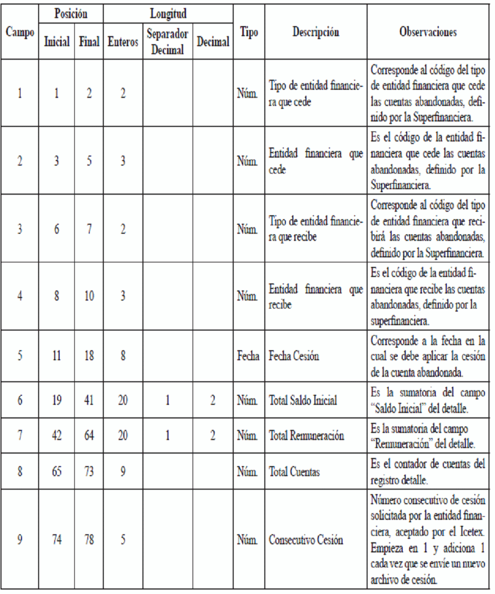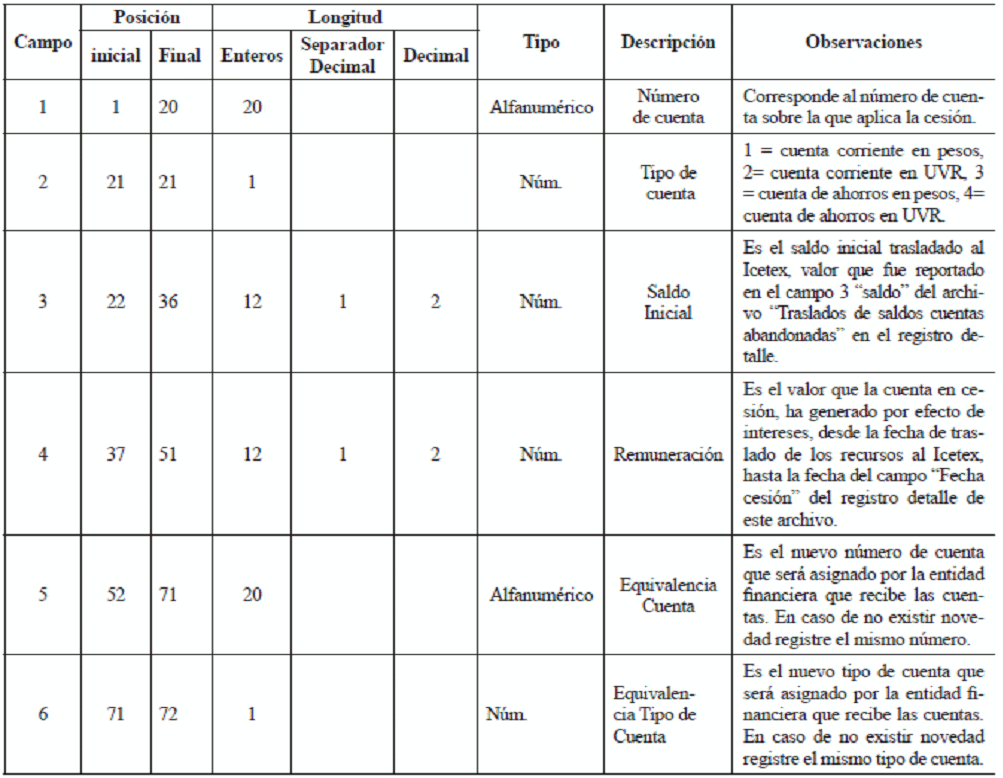 | 5 | Número de Secuencia de Cesión de cuentas Abandonadas aceptado por ICETEX | Consecutivo que denota el archivo a reportar. Coincide con el Registro Encabezado “Consecutivo Cesión”. |