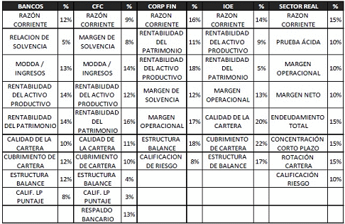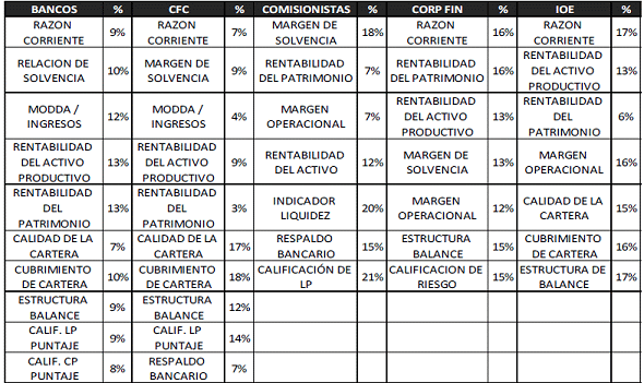 De conformidad con lo anterior, los indicadores financieros y los indicadores de gestión (Calificación de Riesgo del Emisor y Contraparte) que se aprueban para cada tipo de Emisor y Contraparte, al igual que la respectiva ponderación son: