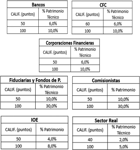 La asignación de cupo por Emisor y Contraparte basado en el sector al que pertenezca, es obtenida en términos del puntaje total generado, el cual se transformará en un porcentaje de asignación a través de una curva exponencial construida para cada sector a partir del rango de puntajes de aprobación frente al rango de porcentajes de patrimonio técnico o contable, definidos a continuación: