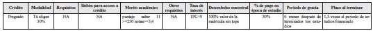 “1o. En la tabla de Características y Condiciones Financieras, se determina el mérito académico de 260 a 230 (puntaje de la prueba Saber 11) como requisito mínimo de acceso a la línea Tú eliges 30% de la siguiente forma: