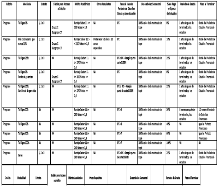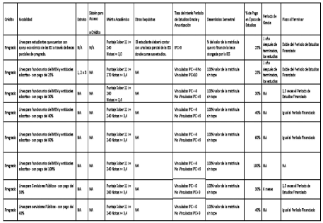 Que el literal m) del numeral 1 del artículo 12 del Reglamento de Crédito establece que la modalidad de crédito “alianzas” son convenios que se celebran con entes públicos y privados para financiar matrícula, sostenimiento o fondo de garantía, y define como su característica principal no tener pagos en la época de estudios y que la amortización del crédito se realiza una vez terminados estos.