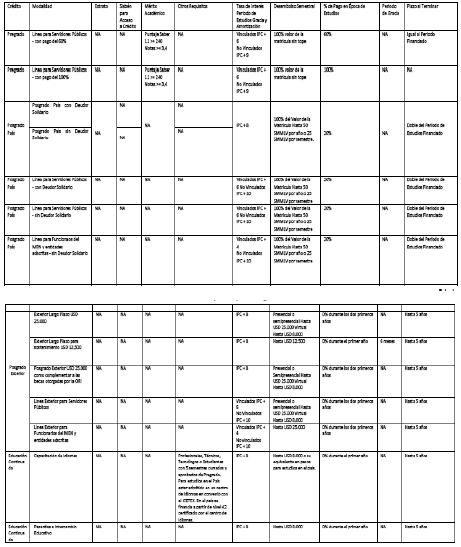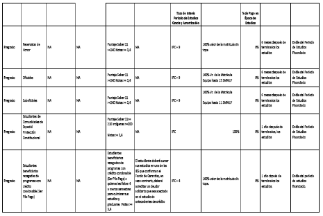 Se financiarán programas conducentes a títulos oficiales, programas bajo la metodología presencial, virtual y/o a distancia, sin pago en la época de estudios durante los dos (2) primeros años. La amortización del crédito se realizará una vez terminados los estudios.