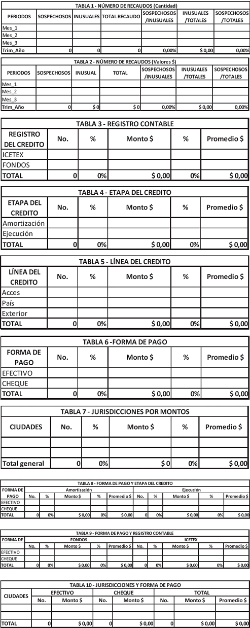 El Icetex remitirá a la UIAF dentro de los diez (10) primeros días calendario del mes siguiente al de corte, un informe mensual de las transacciones en efectivo realizadas a través de los establecimientos de crédito respectivos que superen las cuantías establecidas en el instructivo Anexo II de la Circular Básica Jurídica de la Superintendencia Financiera.