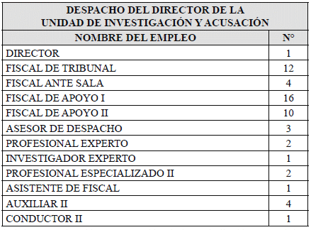 ARTÍCULO 3o. <Acuerdo derogado por el artículo 3 del Acuerdo AOG 12 de 2023> <Consultar acuerdos que modifican este artículo en Notas de Vigencia. El texto ORIGINAL es el siguiente:> El Despacho del Director de la Unidad de Investigación y Acusación (UIA) cumplirá las funciones asignadas con la planta de empleos que se señala a continuación: