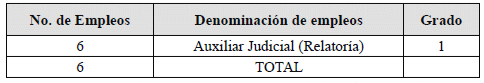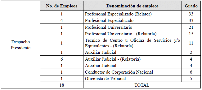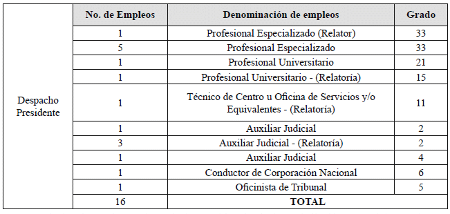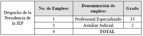 Que de la planta de empleos de la Presidencia de la Jurisdicción Especial para la Paz (JEP) se requiere suprimir un (1) empleo de Profesionales Especializados Grado 33 y los tres (3) empleos de Auxiliar Judicial Grado 2 (Relatoría) para crear seis (6) empleos de Auxiliar Judicial Grado 4 (Relatoría), los cuales seguirán adscritos a ese Despacho.