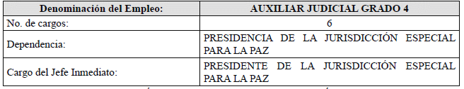 Que los empleos anunciados se prevé que sean provistos con servidores públicos que cumplan con las labores de tipo técnico y de apoyo para las Secciones y Salas de la Jurisdicción Especial para la Paz (JEP), para lograr los fines esenciales en desarrollo de las actividades judiciales propias de la entidad.
