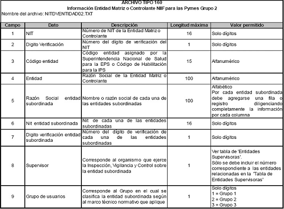 -- Información Entidad Matriz o Controlante NIIF para las Pymes Grupo 2 – Archivo Tipo 160, el cual será diligenciado únicamente por las entidades que presenten esta condición.