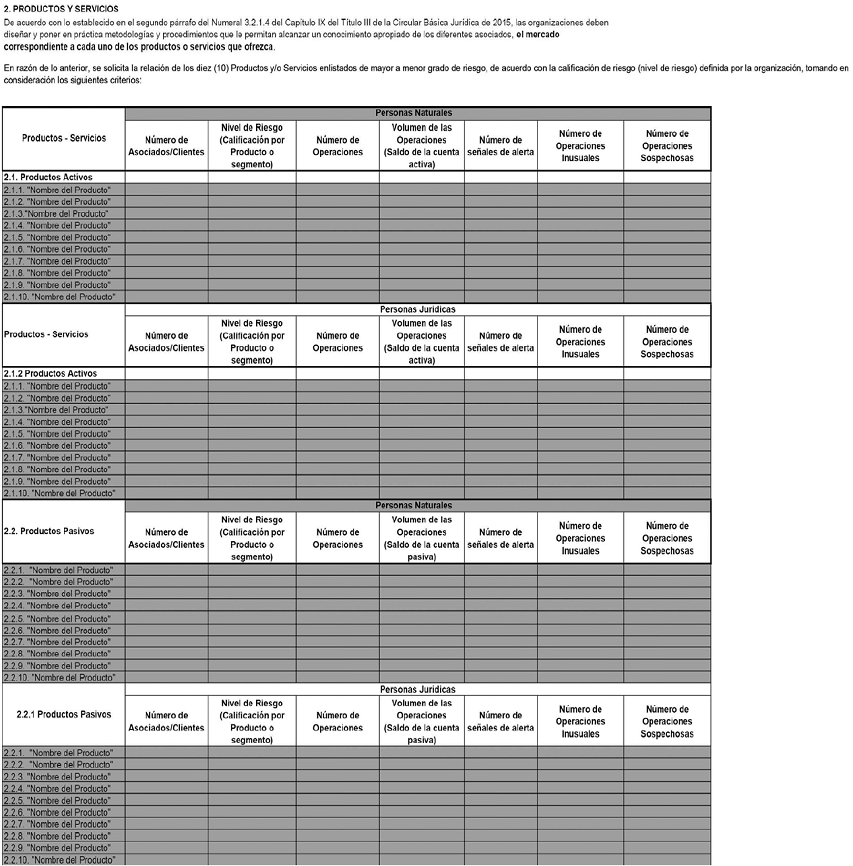 2.1. Productos activos: En este numeral se deberá determinar el número de asociados/clientes que son personas naturales y personas jurídicas, correlacionando ese criterio con el nivel de riesgo (Calificación por producto o segmento), Número de operaciones y el volumen de operaciones (saldo de la cuenta activa) en pesos, se debe indicar el número de señales de alerta, Operaciones Inusuales y Operaciones sospechosas si se han presentado en el período de reporte respectivo (semestralmente).