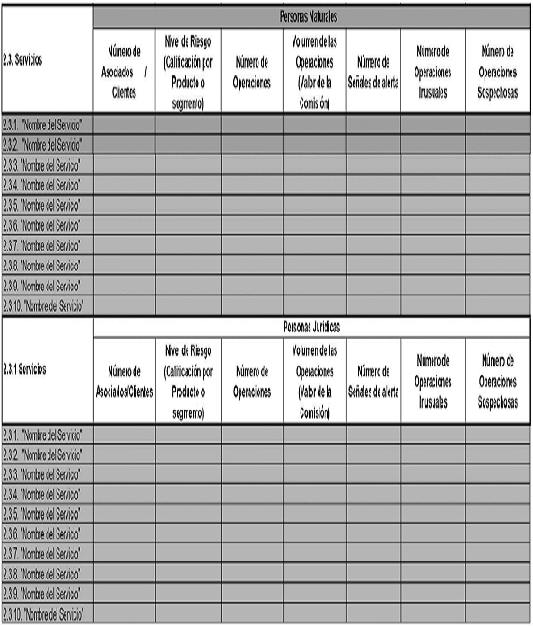2.3. Servicios: En este numeral se deberá determinar el número de asociados/clientes que son personas naturales, correlacionando ese criterio con el nivel de riesgo (Calificación por producto o segmento), número de operaciones y el volumen de operaciones (Valor de la comisión) en pesos, se debe indicar el número de señales de alerta, Operaciones Inusuales y Operaciones sospechosas si se han presentado en el período de reporte respectivo (semestralmente).