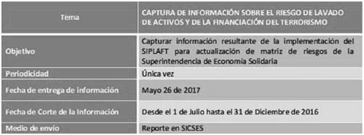 Para tal efecto se diseñaron unos instrumentos de captura de información que se elaboraron a partir de las instrucciones contenidas en la Circular Básica Jurídica 2015: Capítulo XI del Título II para las cooperativas de ahorro y crédito y Capítulo IX del Título III para las organizaciones de economía solidaria que no ejercen actividad financiera. Enmarcado en lo anterior, la remisión de estos formatos se efectuará una única vez, y contendrá la información resultante del segundo semestre de 2016.