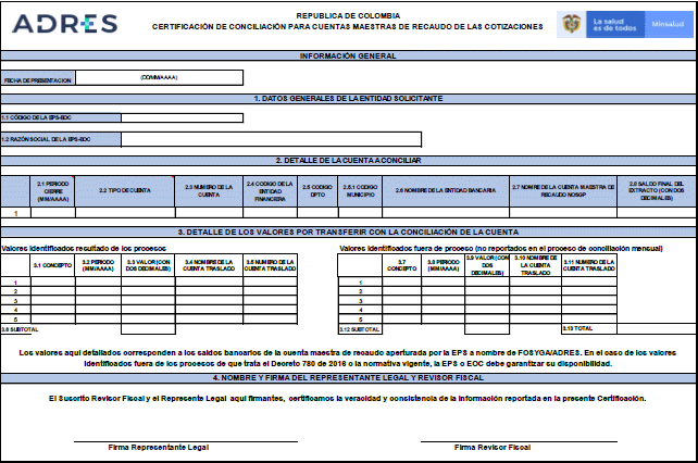 Para el efecto, la ADRES dispondrá la actualización del formato de conciliación denominado “Certificación de Conciliación para Cuentas Maestras de Recaudo de las Cotizaciones”, el cual hace parte de la presente Circular.