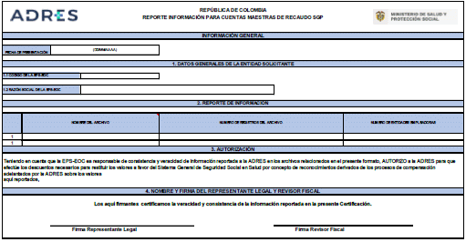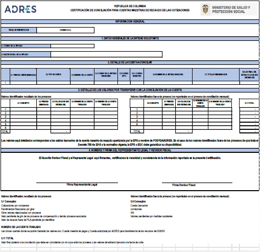 - La conciliación se presentará a la ADRES en el formato denominado “CERTIFICACIÓN DE CONCILIACIÓN PARA CUENTAS MAESTRAS DE RECAUDO DE LAS COTIZACIONES” que hace parte de la presente Circular y en el cual la EPS-EOC registrará los datos requeridos en el mismo.