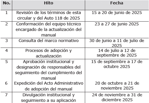 En cumplimiento de lo establecido en el ordinal segundo del Auto número 118 de 2025, en el marco de la VI sesión ordinaria del MESSEP, llevada a cabo el pasado 6 de junio de 2025, se aprobó el cronograma a seguir por parte de las Entidades Estatales vinculadas al cumplimiento de la Sentencia T-302 de 2017, para actualizar sus manuales de contratación, supervisión e interventoría. Tal cronograma está compuesto de las siguientes hitos y fechas: