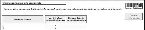 La Entidad Estatal debe seleccionar por medio del carácter X el tipo de información financiera que tiene el o los proponentes en el caso de que este sea un oferente plural. Los proponentes pueden tener (a) más de un (1) año de información financiera o menos de un (1) año de información financiera: