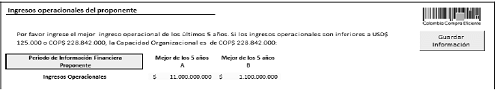 Si el proponente tiene uno (1) o más años de información financiera, el proponente debe ingresar el mejor ingreso operacional de los últimos cinco (5) años. Si el proponente tiene menos de un (1) año de información financiera, la aplicación automáticamente le asignará ingresos operacionales de USD125.000. En caso de que el proponente tenga información financiera de uno (1) o más años y tenga ingresos operacionales inferiores a USD125.000, la aplicación también le asignará al proponente este mismo valor en ingresos operacionales: