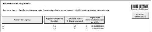 Adicionalmente, la Entidad Estatal debe ingresar la (a) liquidez; (b) número de profesionales; (c) el valor total contratado del proponente; y (d) el patrimonio.