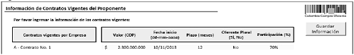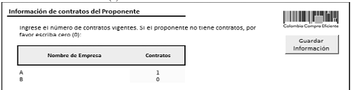Información de contratos en ejecución: Este botón despliega un formulario en el cual se debe escribir el número de Contratos en Ejecución que a la fecha de presentación de la oferta tiene el proponente. Si el oferente es plural debe indicar el número de Contratos en Ejecución de cada uno de los integrantes del oferente plural. Si el proponente no tiene Contratos en Ejecución debe escribir el número cero (0):