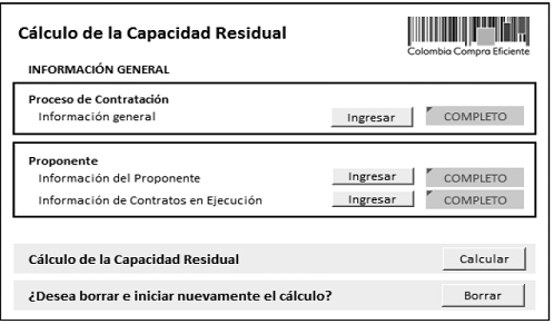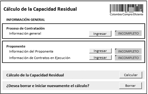 Colombia Compra Eficiente pone a disposición de los partícipes del sistema de compra y contratación pública la aplicación en Excel llamada “Capacidad Residual” para: (a) ayudar a las Entidades Estatales a establecer la Capacidad Residual en los Procesos de Contratación de obra pública; (b) ofrecer a los proponentes una herramienta para verificar si cuentan con la Capacidad Residual exigida en los Procesos de Contratación en los cuales tienen interés y para acreditar esta en tales procesos; y (c) ofrecer a las Entidades Estatales una herramienta para verificar la información presentada por los proponentes para acreditar la Capacidad Residual.