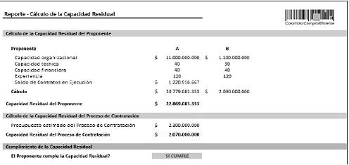 El botón “Calcular” realizará todos los cálculos establecidos en la metodología descrita en el presente manual y creará un reporte en donde definirá si el proponente cumple con la Capacidad Residual Exigida para el presente Proceso de Contratación: