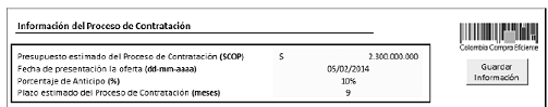 Información general: La Entidad Estatal debe ingresar la siguiente información del Proceso de Contratación: (a) valor estimado del contrato, (b) porcentaje de anticipo y (c) la fecha de presentación de la oferta y (d) duración estimada del contrato: