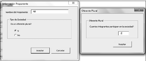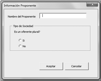 Información del Proponente: Este botón presenta un formulario en el que se especifica: (i) el nombre del proponente e (v) indicación si el oferente es un oferente plural.