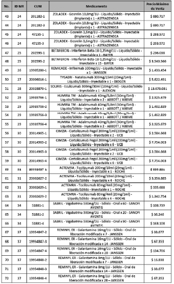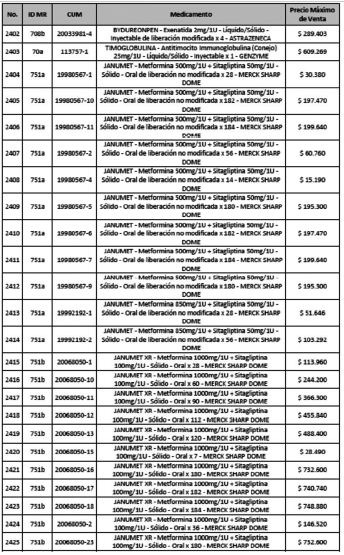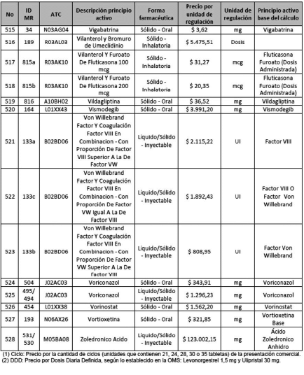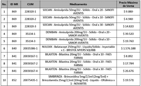 Por la cual se establece el listado de los medicamentos sujetos al régimen de control directo de precios, se fija el precio máximo de venta y el precio por unidad de regulación de Medicamentos Vitales No Disponibles y se dictan otras disposiciones.