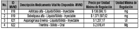 ARTÍCULO 4o. PRECIO POR UNIDAD DE REGULACIÓN DE MEDICAMENTOS VITALES NO DISPONIBLES. <Circular derogada por la Circular 13 de 2022. Surte efecto a partir del 26 de septiembre de 2022> El Precio Máximo de Venta por unidad de regulación de los siguientes Medicamentos Vitales No Disponibles para las operaciones realizadas con recursos asignados a la salud, es el siguiente: