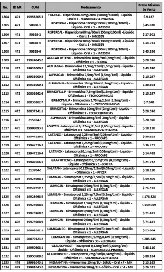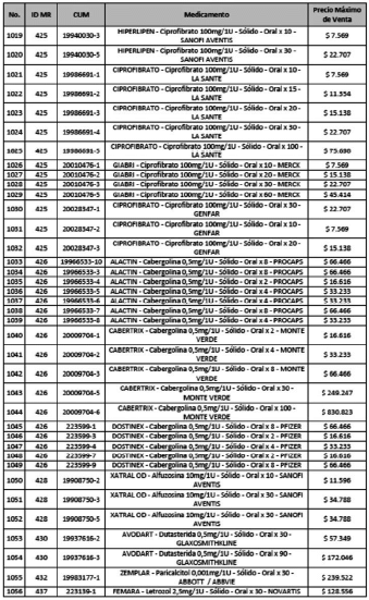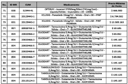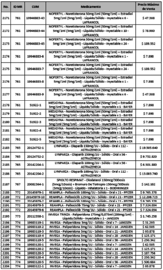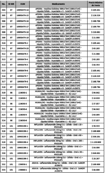 Que la Comisión Nacional de Precios de Medicamentos y Dispositivos Médicos (CNPMDM) evidenció que los mercados relevantes ID 98 correspondiente al principio activo insulina lispro con forma farmacéutica líquido-sólido inyectable para el CUM 224030-7; e ID 701 correspondiente al principio activo estriol con forma farmacéutica semisólido-vaginal para los CUM 19997491-5 y 19997491-6, y serán eliminados por pertenecer a muestras médicas según lo reportado en el registro sanitario expedido por el INVIMA.
