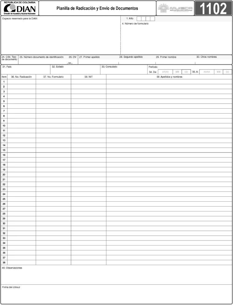 4. Diligenciar la “Planilla de Radicación y Envío de Documentos”, Modelo 1102 (Anexa), en original y copia, así:
