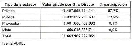 En términos generales, el cuadro anterior evidencia que el mecanismo de giro directo presenta una distribución heterogénea de los recursos, con predominancia de los prestadores privados, por lo ya comentado, seguido por los prestadores públicos, mientras que los proveedores y los prestadores mixtos concentran una participación minoritaria dentro del total de pagos realizados".