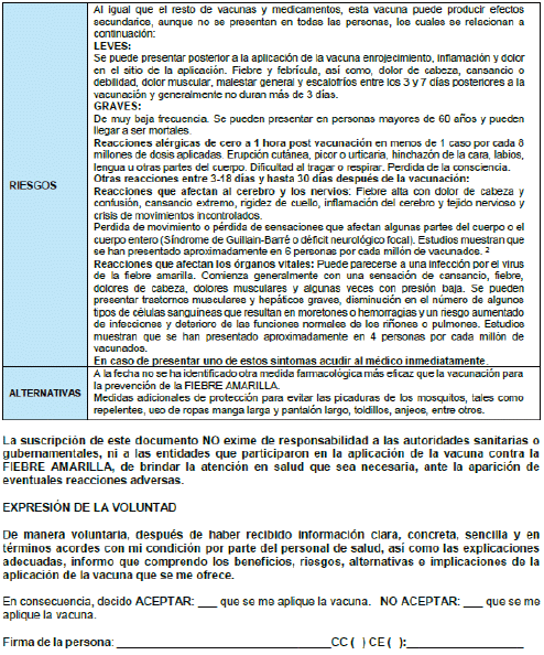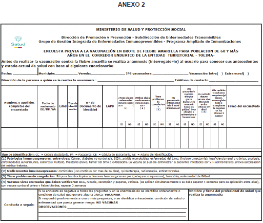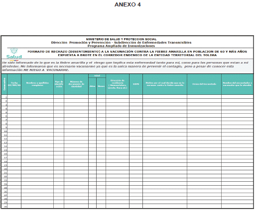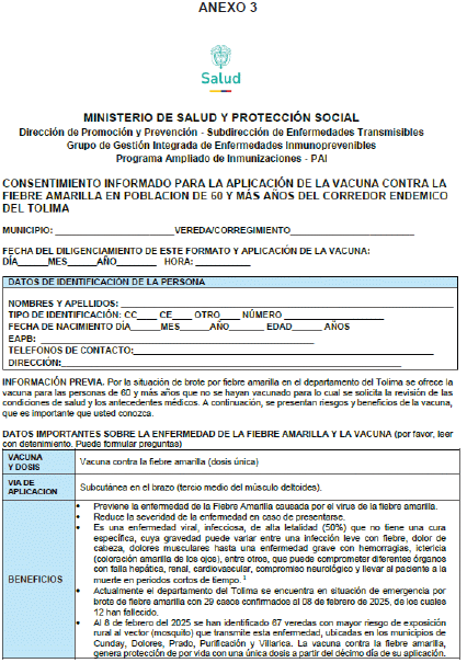 2.3.1.1.11. Difundir los formatos anexos a la presente circular, cuyo diligenciamiento debe estar a cargo de los profesionales de la salud de las IPS (médico, enfermera), incluido los Equipos Básicos de Salud (médico, enfermera), siendo un requisito previo a la vacunación, los cuales son: “Consentimiento informado para la aplicación de la vacuna contra la fiebre amarilla en población de 60 y más años en el corredor endémico por brote de FA del Tolima”, “Encuesta previa a la vacunación en brote de fiebre amarilla para la población de 60 y más años del corredor endémico del Tolima” y “Formato de rechazo a la vacunación contra la fiebre amarilla en población de 60 y más años expuesta a brote en la ET Tolima”, con el fin de detectar y declarar condiciones de salud que pudiesen ser contraindicación para la vacuna.