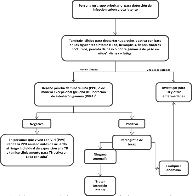 El primer paso en el proceso diagnóstico de la TB latente es descartar la tuberculosis activa en los grupos priorizados, preguntando a las personas si presentan síntomas de TB tales como: tos, hemoptisis, fiebre, sudores nocturnos, pérdida de peso o pobre ganancia de peso (niños), disnea y fatiga[6].