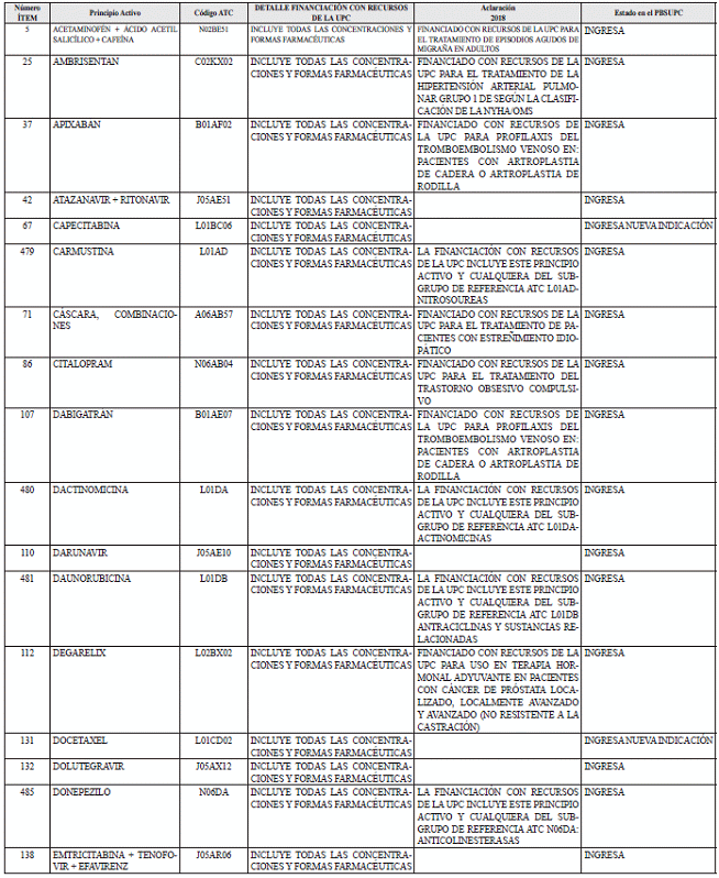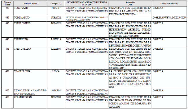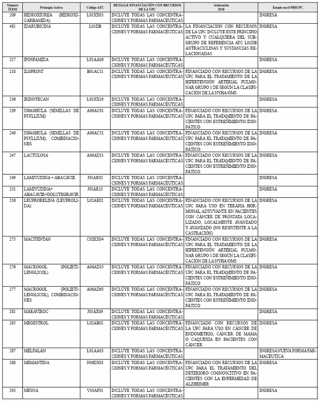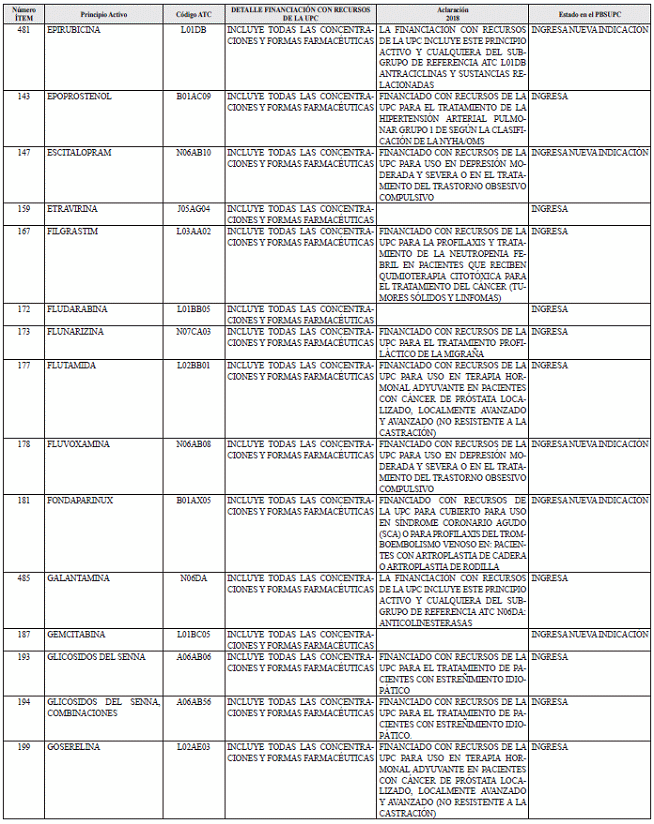 Para mayor ilustración, en el documento denominado “ANEXO NÚMERO 2. MEDICAMENTOS, USOS Y FORMAS FARMACÉUTICAS QUE INGRESAN A LA FINANCIACIÓN CON CARGO A LA UPC A PARTIR DEL 1 DE ENERO DE 2018”, se relacionan las inclusiones de nuevos medicamentos al Plan de Beneficios en Salud con cargo a la UPC y la expresión de medicamentos en nuevos subgrupos de referencia.