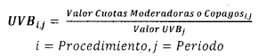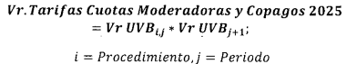 4.2. Se calculan los valores de las cuotas moderadoras y copagos, mediante la multiplicación del factor de equivalencia en UVB 2024 de los valores de las cuotas moderadoras y los copagos, según corresponda, por el valor de la Unidad de Valor Básico (UVB) para la vigencia 2025, de acuerdo con la siguiente fórmula: