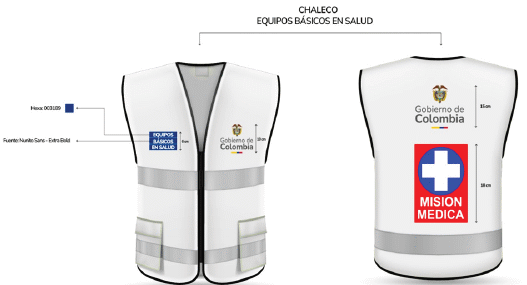 Parte posterior: En la parte superior, se repite el logotipo del Gobierno de Colombia, con una altura de 15 cm y el emblema de Misión Médica con las proporciones que se describen en el enunciado “Características del emblema (grafismo)”, tiene una franja reflectiva horizontal en la parte inferior.
