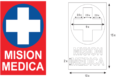 El emblema de Misión Médica consta de un rectángulo rojo, presentado verticalmente, en cuyo interior se encuentran dos elementos: