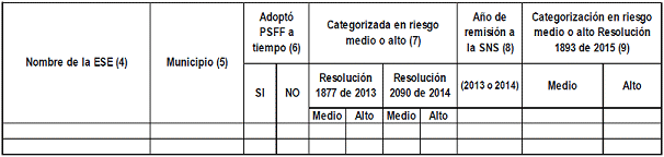 (9) Categorización en riesgo medio o alto Resolución número 1893 de 2015: Marcar con una X el nivel de riesgo medio o alto, en el cual quedó categorizada la ESE en el 2015.