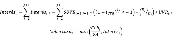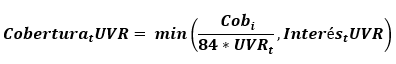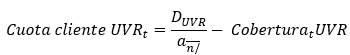 Cuota_Cliente_UVRt se calcula como una anualidad uniforme ordinaria en UVR menos la cobertura en UVR al momento t, conforme se establece en la siguiente expresión: