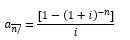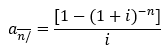 | Corresponde al valor presente de n pagos uniformes unitarios periódicos a la tasa efectiva mensual i, calculados de acuerdo con la siguiente expresión: | |