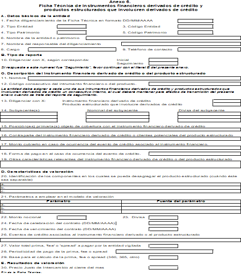 Del anterior procedimiento, se excluyen los instrumentos financieros derivados de crédito y los productos estructurados que involucren derivados de crédito, en cuyo caso las entidades vigiladas siempre deben reportar la Ficha Técnica del Anexo 6, de la siguiente manera:
