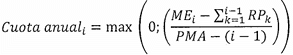 es la cuota de reconocimiento gradual aplicable al año i. El valor de esta cuota sólo podrá ser igual o superior a 0, sin perjuicio de lo cual las entidades con exceso de reserva podrán adelantar los procedimientos de liberación que corresponda de acuerdo con las normas aplicables.