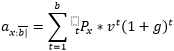 10.7.3.2. Renta temporal en “b” años: La fórmula para el cálculo de esta renta vencida contingente de una sola cabeza, anual, la cual paga una unidad monetaria, es la siguiente: