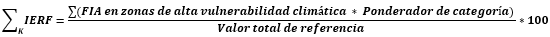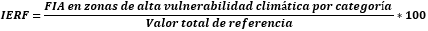 FIA en zonas de alta vulnerabilidad climática: es el monto en COP de las operaciones de crédito, inversión o aseguramiento realizado por parte de las entidades vigiladas por la SFC en zonas de alto riesgo físico, considerando los principios de relevancia y materialidad. Cada categoría se debe multiplicar por un ponderador y el resultado se expresa como el valor agregado correspondiente a las categorías consideradas en el indicador del numeral 1.1. del presente anexo, según su aplicabilidad.