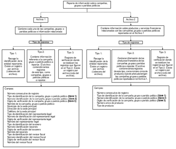 El Archivo 1 que la entidad reportante debe enviar a la UIAF contiene información sobre campañas políticas y partidos políticos. Dentro del archivo en mención se debe incluir 3 tipos de registros: encabezado (registro tipo 1), cuerpo del formato (registro tipo 2) y cola (registro tipo 3).