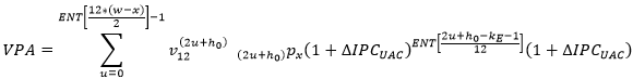 = Valor presente actuarial de una anualidad vitalicia con beneficio bimestral, cuyo valor debe ajustarse el 1 de enero de cada año, de acuerdo con lo establecido en el Decreto 0604 de 2013 o las normas que lo modifiquen, sustituyan o adicionen.