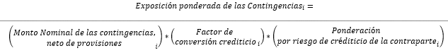 De conformidad con lo establecido en el artículo 2.1.1.3.5 del Decreto 2555 de 2010 la exposición de las contingencias se debe determinar multiplicando el monto nominal de las contingencias neto de provisiones, por el factor de conversión crediticio correspondiente a cada operación, conforme a la siguiente fórmula: