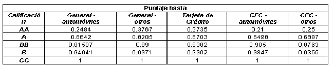| Calificación | General - Automóviles | General – Otros | Tarjeta de Crédito | CFC Automóviles | CFC Otros |