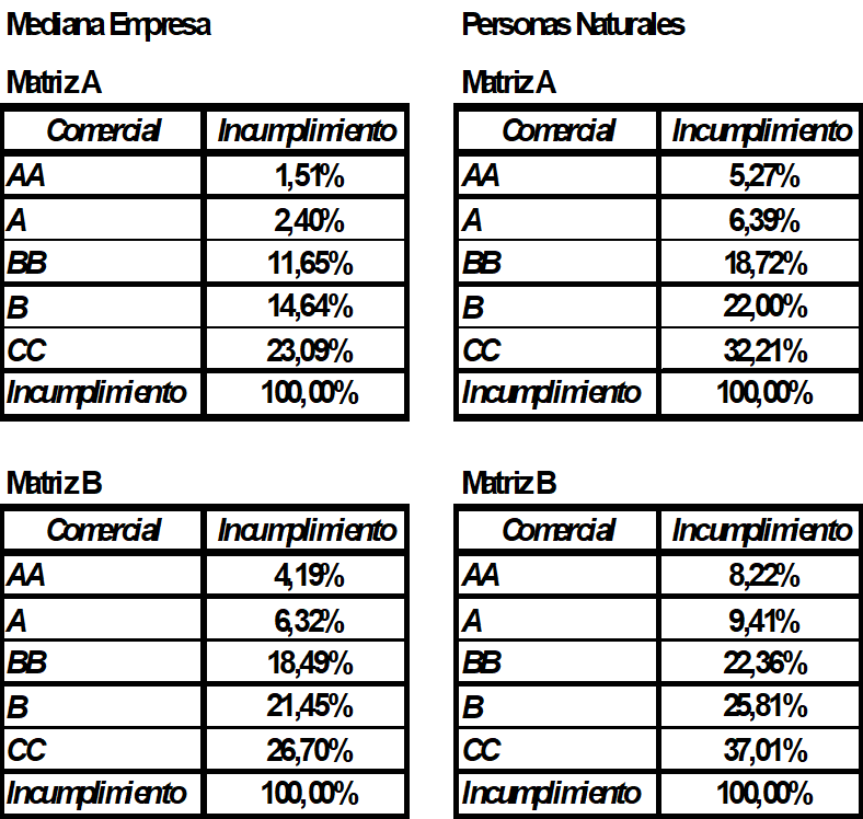 De esta manera, para cada deudor-segmento de cartera de consumo se obtiene la probabilidad de migrar entre su calificación vigente y la calificación de incumplimiento en los próximos 12 meses de acuerdo con el ciclo del comportamiento general del riesgo de crédito.