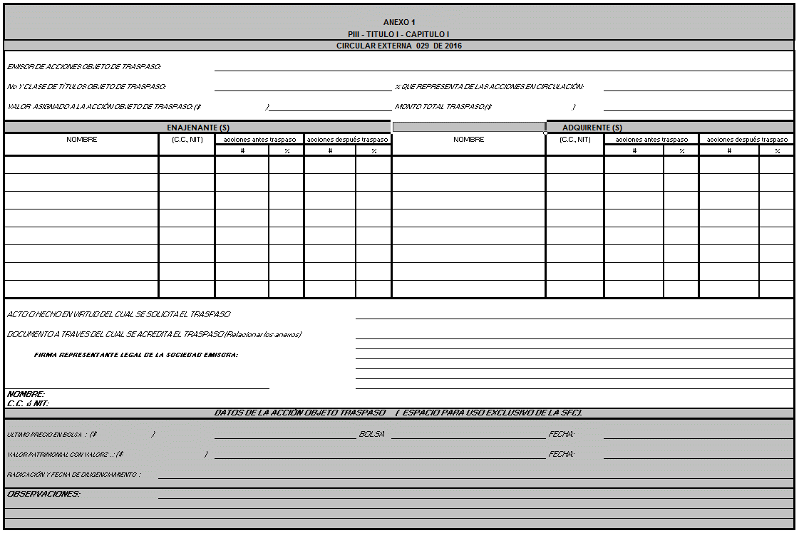 En ejercicio de la facultad señalada en el numeral 9o del artículo 11.2.1.4.2 del Decreto 2555 de 2010, este Despacho considera necesario precisar las necesidades de información con relación a los traspasos de acciones previstos en los numerales 3.1 y 3.2 de la Parte III, Título I, Capítulo I de la Circular Básica Jurídica, expedida mediante la Circular Externa 029 del 3 de octubre de 2014.