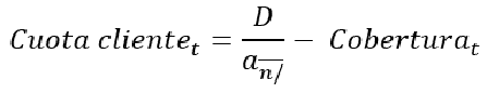 Cuota_Clientet se calcula como una anualidad uniforme ordinaria menos la cobertura al momento t, conforme se establece en la siguiente expresión: